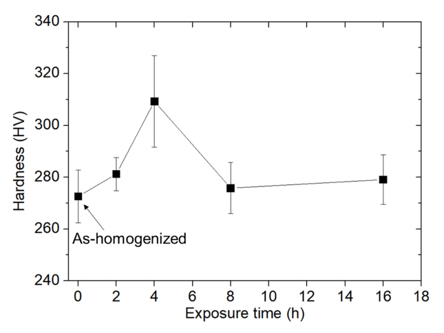 열간 노출 시 조대화(coarsening)가 일어나는 것으로 예상되며 이로 인해 강화 효과가 감소하게 되면서 경도가 감소하는 것으로 생각된다.