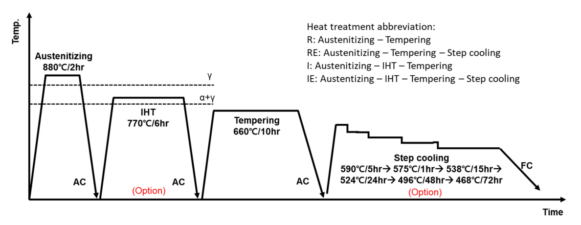 공랭하였다. 이상영역열처리 온도는 dilatometer와 DSC, Andrew [31] 식으로 구한 Ac1, Ac3를 기준으로 결정하였다. 시험에 사용된 열처리 공정을 그림1에 나타내었다. 열처리 방법에 따라 원자로용기강의 품질열처리인 칭과 템퍼링을 모사한 열처리