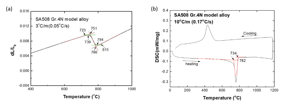 수행하였고, DSC 시험은 10°C/min의 속도로 승온 및 냉각하면서 수행하였다. 시험결과로부터 접선 교차점 방식을 이용하여 Ac1, Ac3 온도를 결정하였다. 그림 2에 승온 속도 3°C/min의 dilatometer 시험결과와 DSC 시험결과를 나타내었다. 또한 다음의 Andrew[28] 식을 통한 상변태 예측온도도 함께 구하였다.