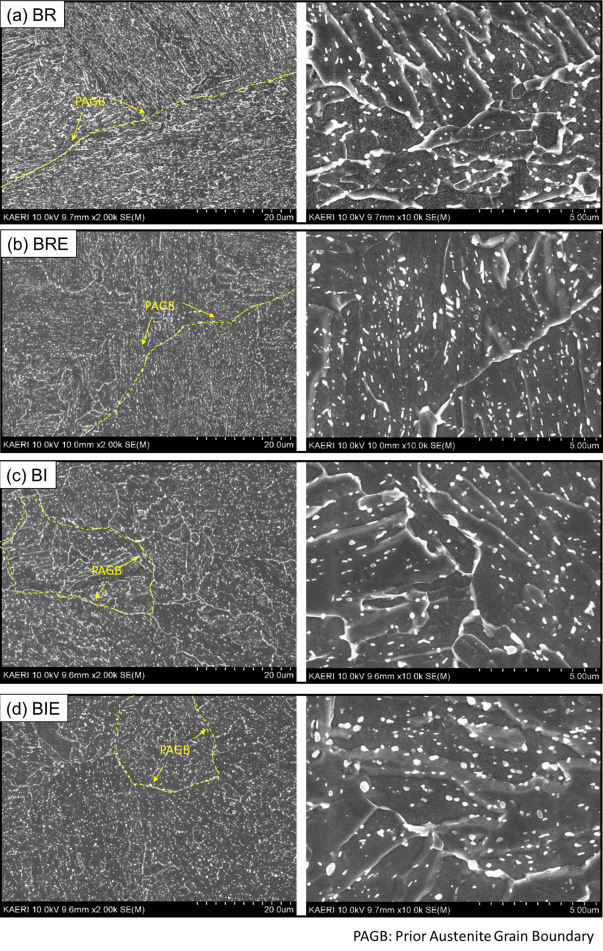 대형모델합금 AR, ARE, AI, AIE시편과 불순물이 많은 소형모델합금 BR, BRE, BI, BIE 시편의 미세조직 및 석출물 SEM 이미지를