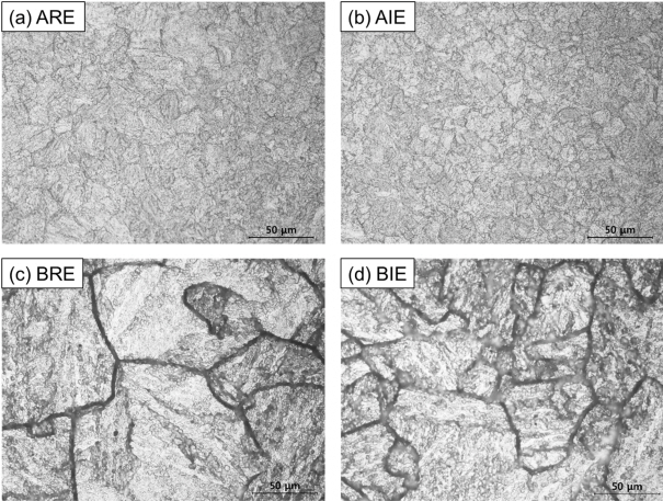 나타내지 않았다. 템퍼취화 열처리를 수행한 ARE, AIE시편에서도 템퍼취화 열처리로 인한 미세조직의 변화는 관찰되지 않았다. B강의 경우도 A강과