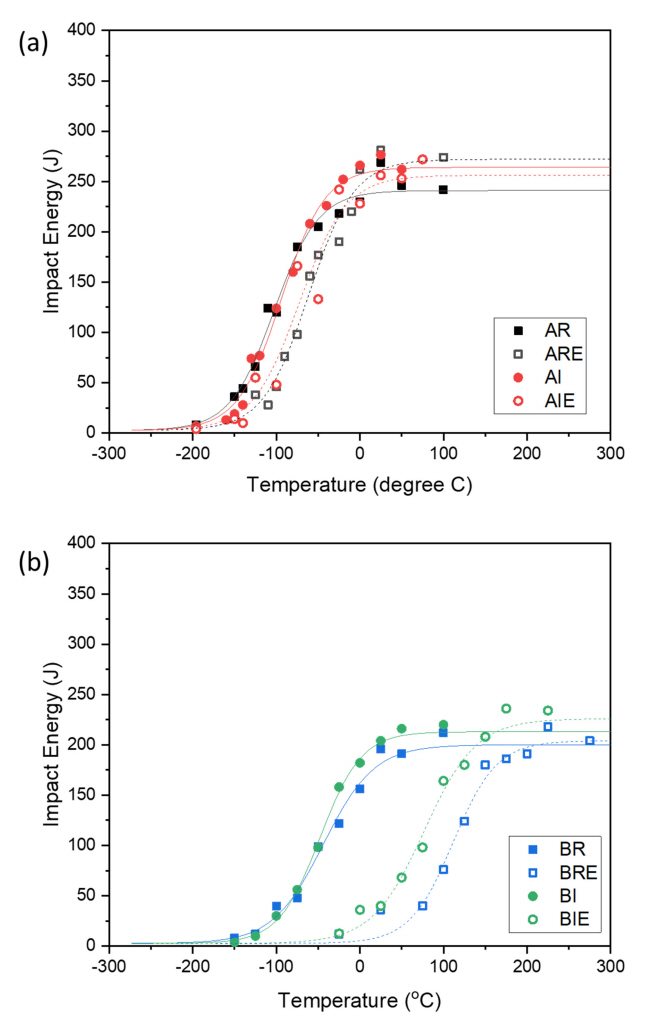 A강과 B강의 온도별 충격흡수에너지와 천이곡선을 그림 7에 나타내었으며, 천이곡선으로부터 구한 상부흡수에너지 (USE), 연성취성 천이온도(DBTT), index 온도(T41J, T68J) 값을 표 4에 정리하였다. AR 시편의 경우 USE는 241J, DBTT -103°C, T41J -140°C로 우수한 인성과 천이특성을 보여주었다. 템퍼취화 열처리시 USE는 30J 증가하였으나 DBTT는 40°C, T41J은 30°C 증가해 천이특성은 저하되는 것으로 나타났다. 이상영역열처리를 적용한 AI 시편은 AR 시편보다 상부흡수에너지는 증가하고 천이특성에는 큰