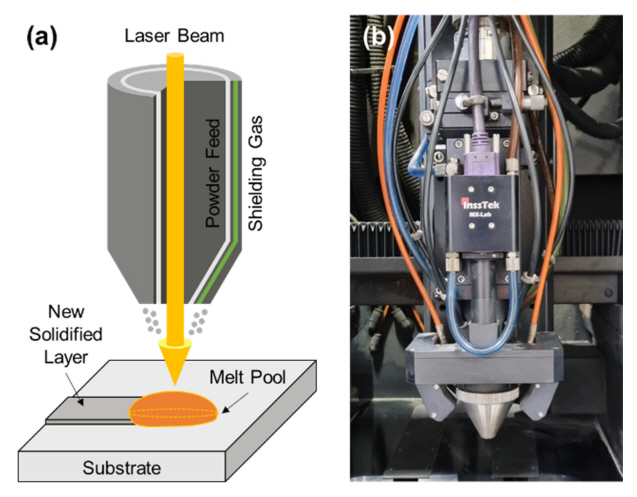 (a) Schematic of the L-DED process. (b) InssTek MX-Lab L-DED facility.