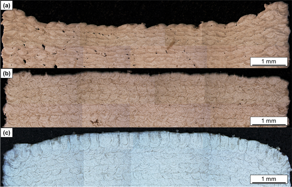 OM image of the top layer (a) 600 mm/min - 110 W (b) 1,080 mm/min - 170 W (c) 600