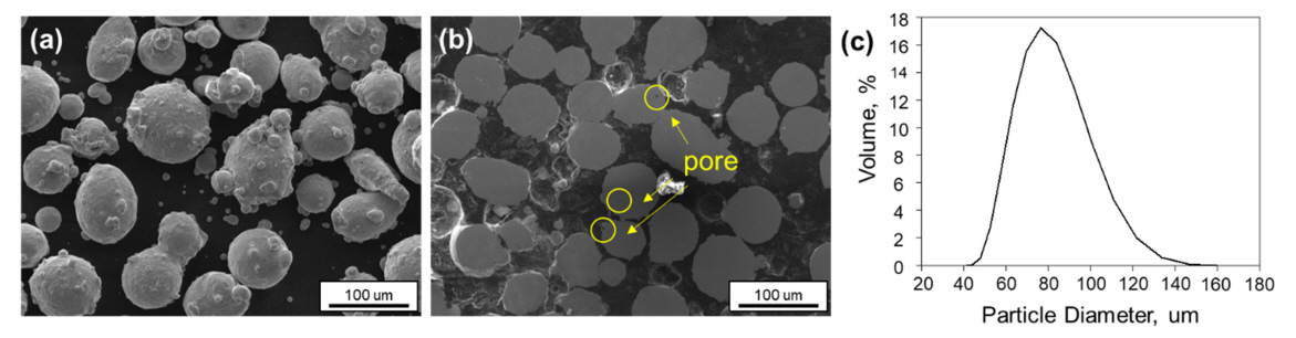 (a) SEM image of surface of AISI 316L powder (b) SEM image of cross section of AISI