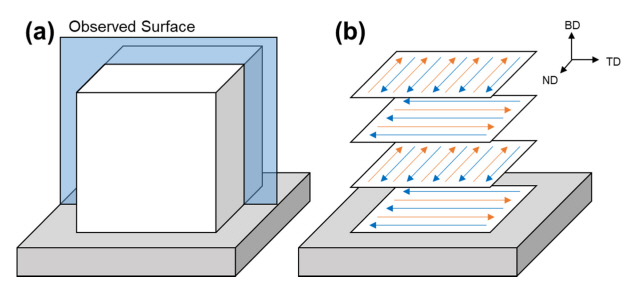 (a) Observed surface of the manufactured cube samples (b) Schematics of scanning strategies