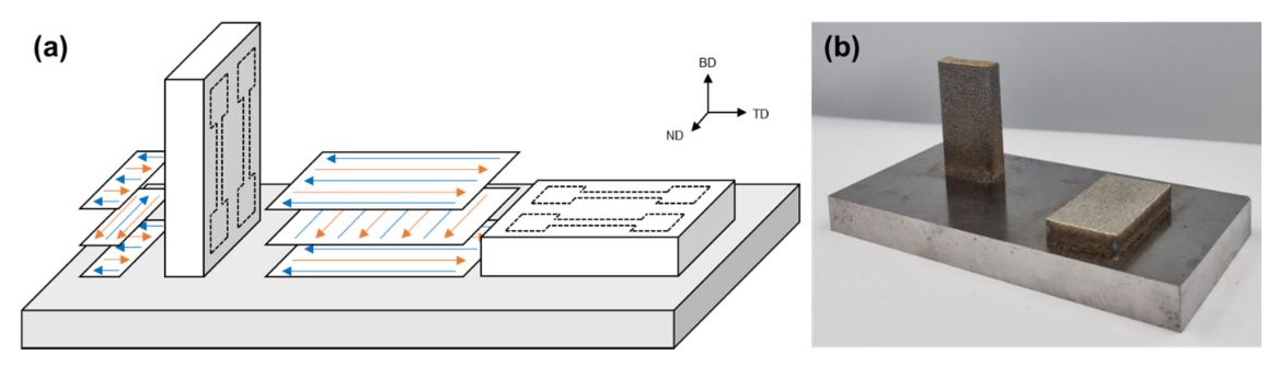 (a) Schematic of scanning strategies for tensile samples (b) Appearances of manufactured