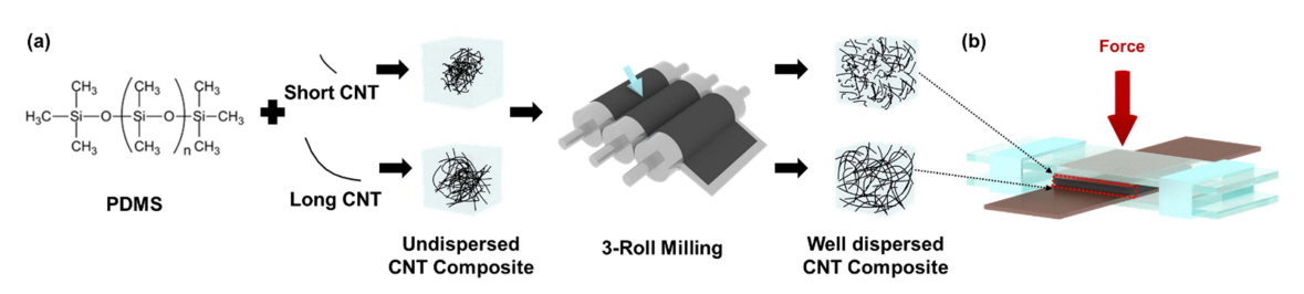 1차 분산을 시켜준다. 그 다음, 인텍사의 3롤 밀링 장비를 사용하여 고분자 내의 필러들을 강력한 전단력을 사용하여 고르게 분산시켜준다[27]. 그림 1(a)는 이 과정을 보여주는 간단한 개략도이며, 이로 인해 CNT의 길이도 감소함을 나타낸다[26].