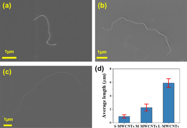 그림 2 (a)-(c)는 주사 전자 현미경을 이용하여 3가지의 다른 종횡비를 갖는 CNT의 단일 가닥을 촬영한 이미지이다. CNT는 반데르발스 인력으로 인한 다발 형태를