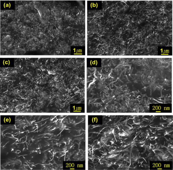 그림 3은 함량 5 wt.%의 CNT/PDMS 복합체의 단면적을 주사 전자 현미경으로 촬영한 사진이다. 그림 2(a)-(c)는 저배율, 그림 2(d)-(f)는 고배율을 측정한 사진이다. 이 사진을 통해 CNT가 길이와 관계없이 3롤 밀링을 통해 응집되지 않고 고르게 분산되었음을 확인할 수 있다. 특히,