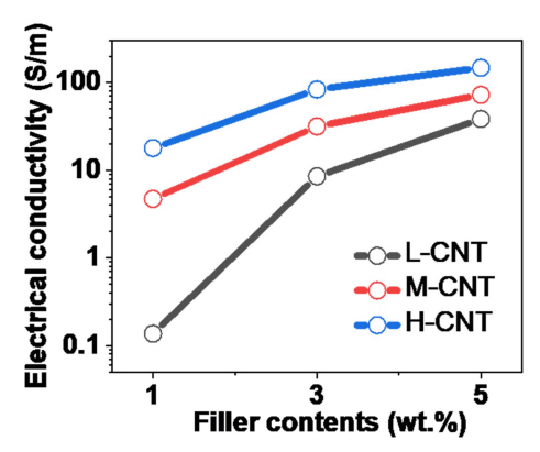 많을수록 전기적 네트워크 형성 확률이 높아 전기전도도가 높아진다. 따라서 그림 4의 결과는 CNT의 함량이 높고 나노 필러의 길이가 길수록 전도성 네트워크 형성이 더 많이 발생한다는 것을 입증한다.