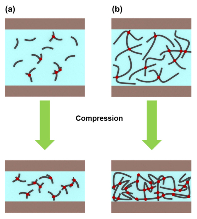 줄어들면서 필러 간의 접합점이 증가한다. 그림 7(b)는 저함량의 H-CNT/PDMS 복합체의 경우로, 압력을 받기 전에 어느 정도 전기적 네트워크를 형성하지만, CNT의 길이가 길기 때문에 압력에 의해