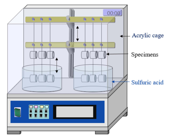 발전 가동 및 정지 상태의 반복에 따른 부식환경 내 무게 감량 측정을 위해 2.3절에서 언급한 바와 동일한 시편을 사용하여 Wet-dry 챔버 (그림 1) 내에 장입하였다. Wet-dry 실험의 경우 5, 10 및 50% 황산 수용액 내 침지 (3시간), 대기 중 건조 (6시간)를 반복하여 일정 cycle