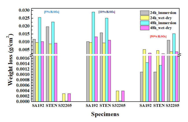 나타내었다. 저농도 황산 조건의 경우와 반대로, 고농도 황산 조건에서 내식성이 열위한 S32205의 경우 Wet-dry 조건에서 침지 시간이 순수