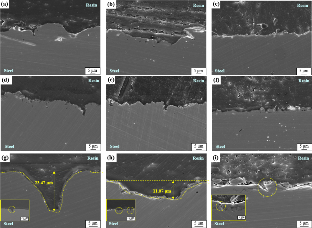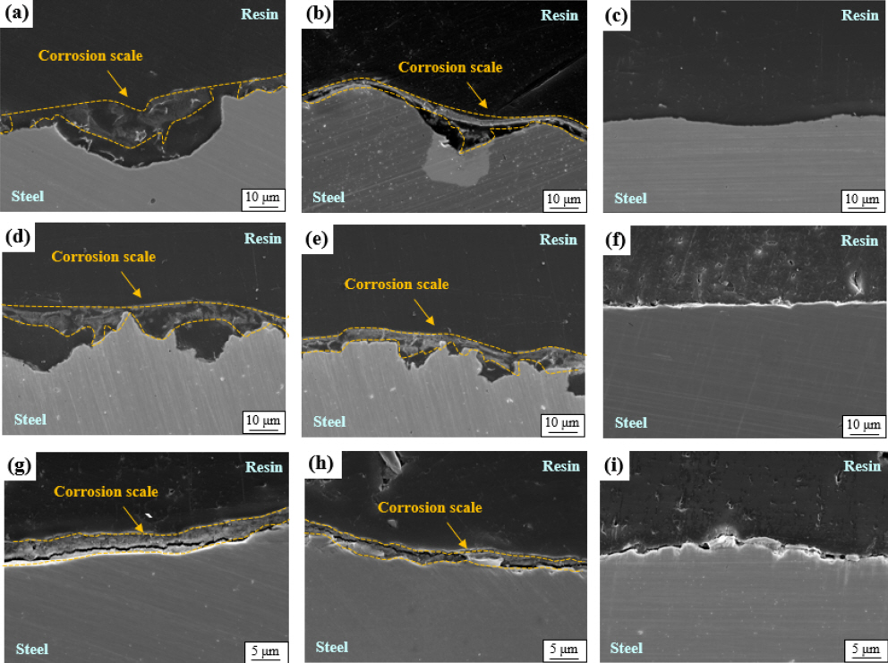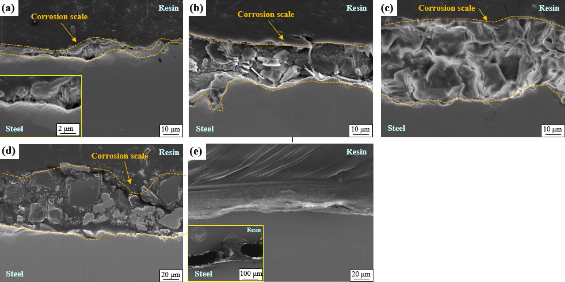 또한, 침지실험 후 각 시편의 단면을 대상으로 마운팅 및 연마 후 FE-SEM을 활용하여 부식된 형상을 관찰하였다. 아울러, 표면에 형성된 부식생성물의