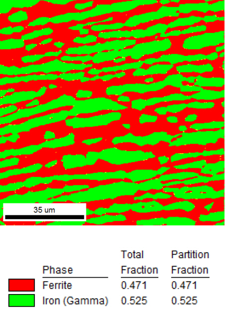 조직으로 구성되어 있었으며 Ferrite 와 Austenite의 비율은 5:5 수준으로 분석되었다 (그림 3).