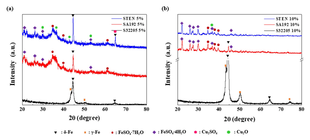 그림 8은 저농도 황산 수용액 환경 내 24 시간 동안 침지한 시편을 대상으로 수행된 XRD 결과를 나타낸다. 탄소강 계열 시편의 경우, 주로 FeSO4·4H2O 및 FeSO4·7H2O의 부식생성물이 검출되었으며 특히 S-TEN의 경우 일부 Cu 기반 산화물 (Cu2O) 및 황산화물 (Cu2SO4)이 검출되었다. 선행문헌에 따르면, 상온 Ferrite 내 고용도 (대략 0.35%)가 낮아 주로 Metallic 형태로 존재하는 Cu는 Fe 및