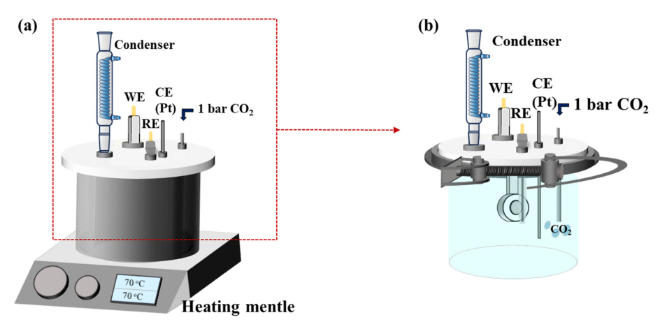 동안 1 bar의 CO2 가스를 유입시키며 70 °C의 온도로 유지시켰다. 전기화학 실험은 작업전극 (Working electrode, WE), 상대전극 (Counter
