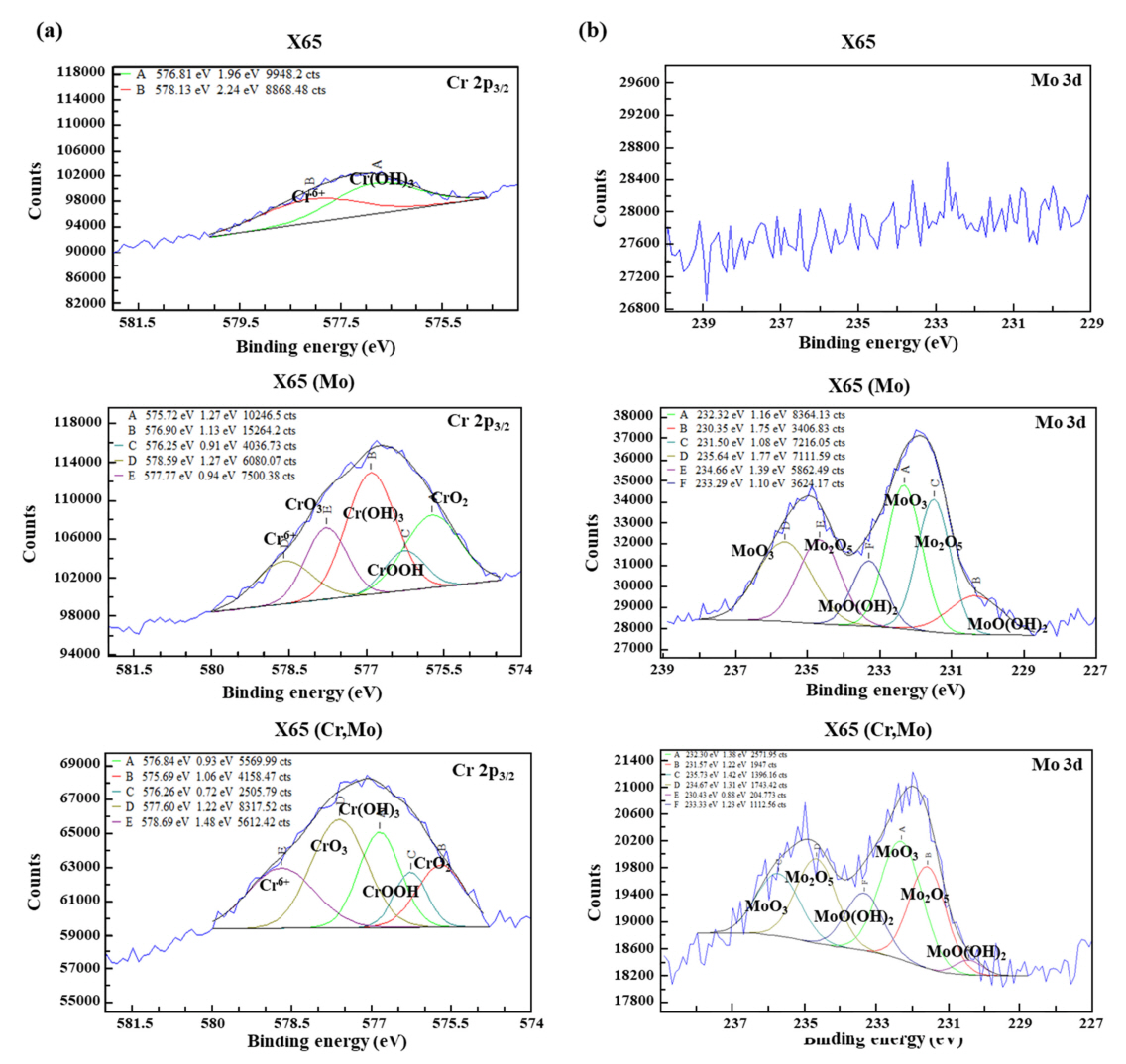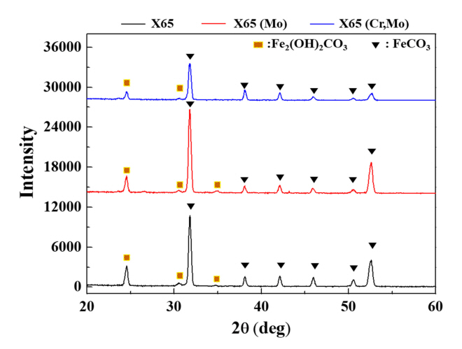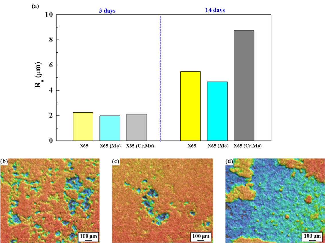 거동을 보였다. 침지 후기 (14일) 무게감량 데이터를 토대로 부식 속도를 도출한 결과 (그림 7(b)), X65 (Mo) < X65 < X65 (Cr,Mo) 순서로 부식속도가 높게 평가되어, 전기화학적 부식거동 분석 결과와 상응하는 것으로 나타났다.