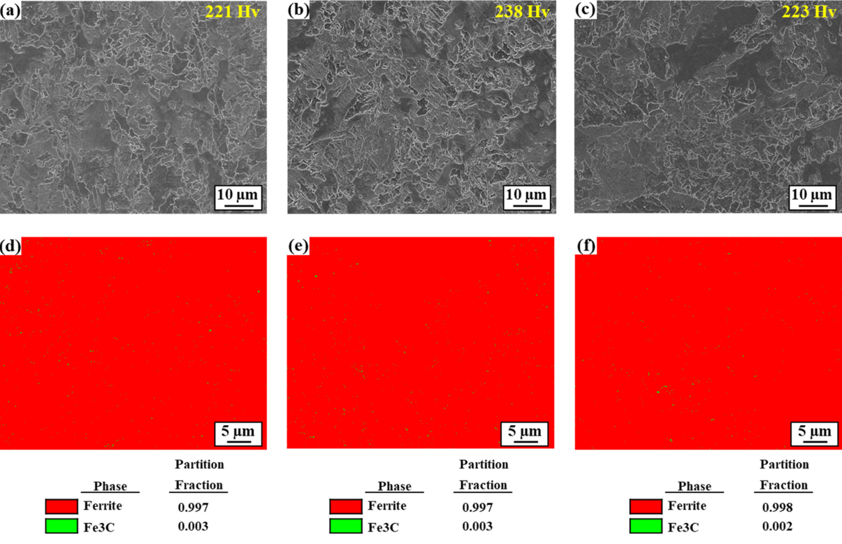 JMatPro를 통한 상 예측 (그림 3)을 토대로 0.4 ~ 0.5 wt% 수준의 Cr 첨가를 통해 M23C6의 석출 분율/온도의 증가를 예상해 볼 수 있으나 FE-SEM 수준의 거시적인 관찰에서는 나타나지 않았다. 탄소강 기반 소재 내 미량의 Cr 첨가는