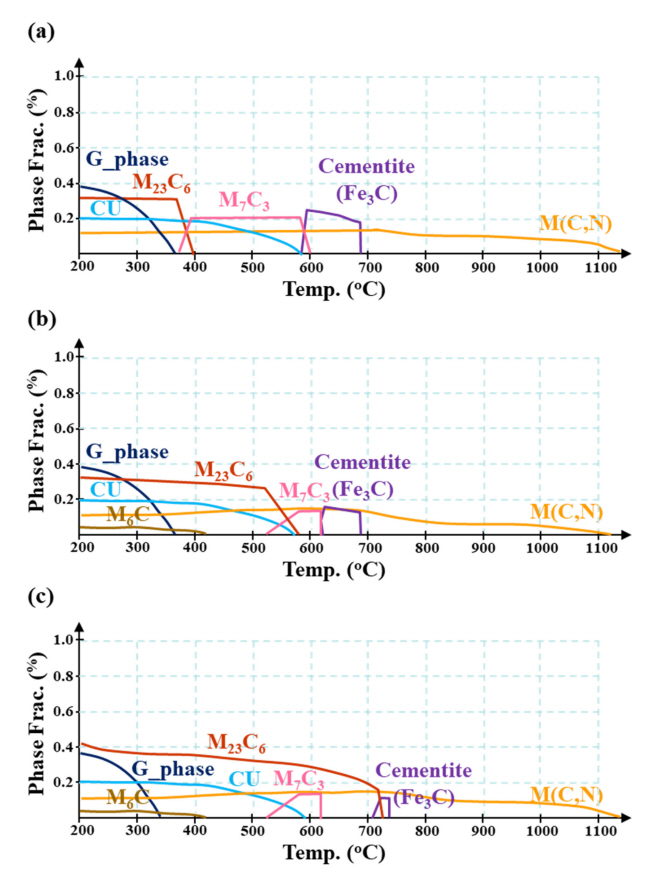 표 1에 세 시편의 화학적조성을 나타내었으며, JMatPro software (Sente software)를 활용하여 탄화물의 석출 상, 온도 및 분율을