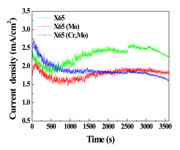 그림 4은 정전위 분극실험 결과를 나타낸다. 초기 시점의 경우 X65 (Cr,Mo) 시편의 전류밀도 값이 가장 높은 수준으로 측정되었는데 이는 Fe 대비