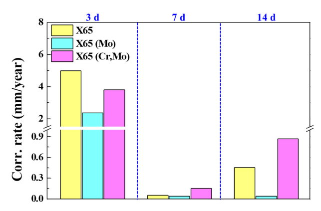 있다. 보다 장기화된 시점 (14일 후)에서는 X65 (Mo)를 제외한 두 시편의 부식속도는 다소 증가되었고 그 중 X65 (Cr,Mo) 시편의 부식속도가