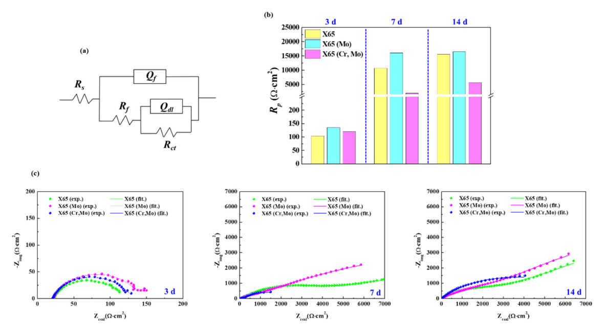 FeCl+, FeCl2+, FeCl2+의 형성 및 흡착[24]에 기인하여 Fe의 양극용해반응 (Fe → Fe2+ + 2e-)이 촉진되는 거동을 예상해 볼 수 있다. 침지 후기 시점에서는 높은 수준의 분극저항 값 (대략 5000 ~ 15000 Ω·cm2)이 도출되었고 표면 생성물 형성에 따른 부식반응 억제효과를 추측할 수 있다. 이 경우에서도 X65 (Mo) 시편의 분극저항이 가장 높은 반면 X65