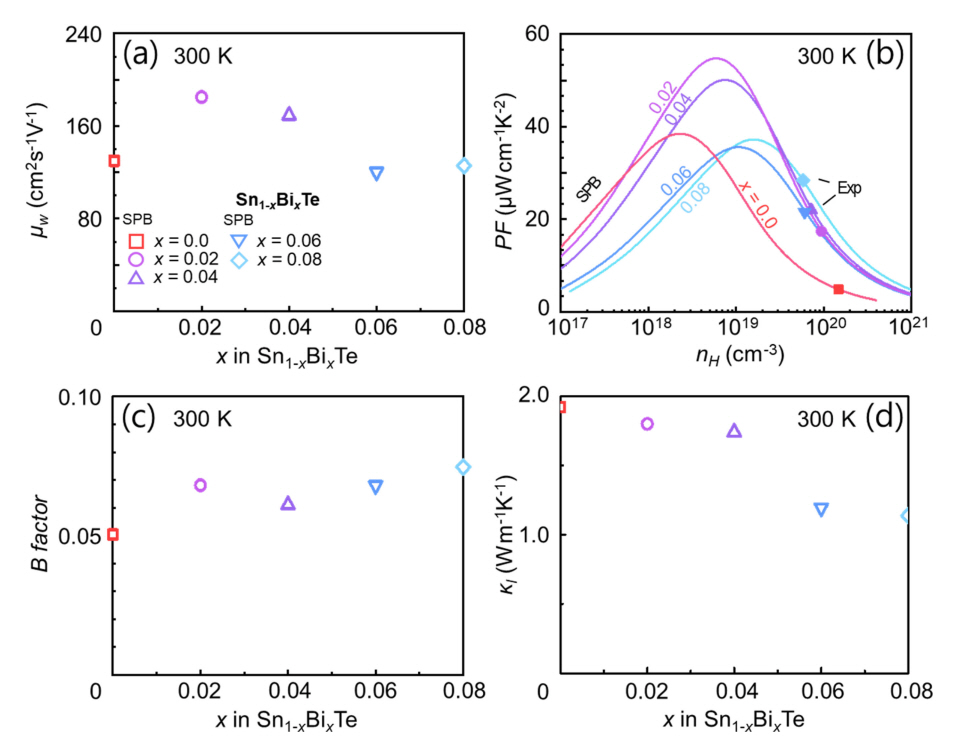 수 있다. Zhou et al.의 기존 연구 결과를 기반으로 300K에서 Sn1-xBixTe (x=0, 0.02, 0.04, 0.06, 0.08)의 밴드 인자인 상태밀도 유효 질량(md*), 비축퇴이동도(μ0), 가중이동도(μw) 및 B-factor를 Single Parabolic Band(SPB) 모델을 통해 계산했다[26]. Bi 도핑이 각각의 밴드 인자에 미치는 영향을 분석하고, 계산된 밴드 인자들을 통해 원소가 도핑된 SnTe 소재 내에서 얻을 수 있는 가장 높은