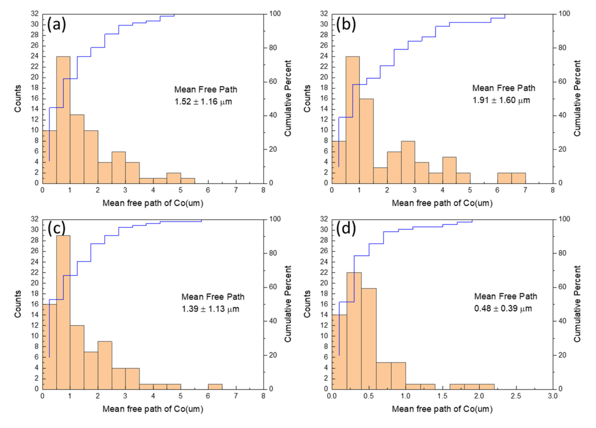์ ํฌ๊ธฐ(dwc), Co ๋ฐ์ธ๋์ ์์ญ์ ํฌ๊ธฐ ํ๊ท ๊ฐ์ธ ํ๊ท ์์ ๊ฑฐ๋ฆฌ(Mean Free Path, MFP) ๋ฐ ์ ์ฒด ๊ณ๋ฉด ์ค WC๊ณผ WC ์
