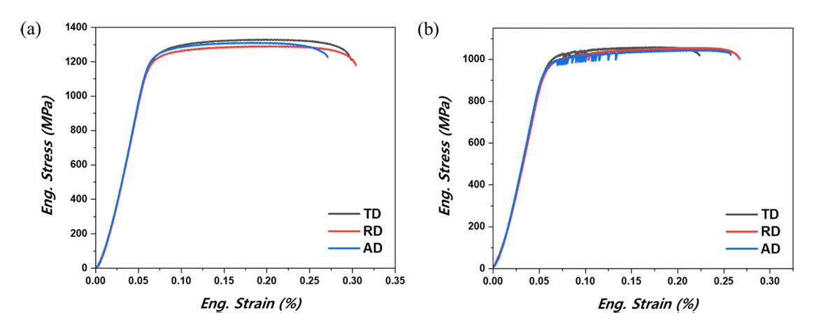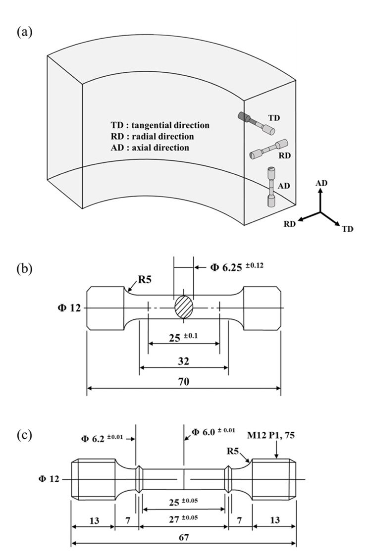 Tangential direction (TD 방향)으로 각 방향당 시험편을 3개씩 가공하였으며 시편의 방향 도면을 그림 1(a)에 나타내었다. 인장 특성을 평가하기 위해 ASTM E8/E8M 및 ASTM E21 규격으로 인장 시험편(그림 1(b))을 제작하였다. 만능재료시험기 (Universal Testing Machine, UTM, Z600 & Z100, Zwick-Roell)를 통해 상온
