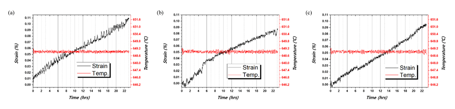 및 649°C에서의 방향에 따른 기계적 특성을 분석하였다. 또한 ASTM E139 규격으로 응력 파단 시험편 (그림 1(c))을 제작하여 응력 파단 시험기 (Creep Testing Machine, CTM, RB305, R&B)를 통해 649°C에서 689 MPa 응력으로