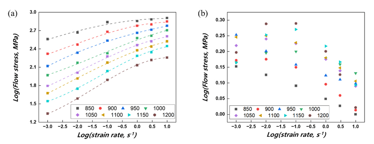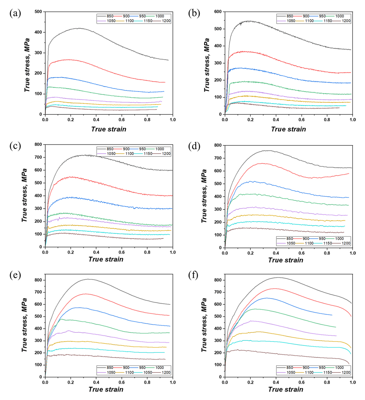 50°C 간격으로 8개의 온도 조건(850, 900, 950, 1000, 1050, 1100, 1150, 1200°C)과 6개의 변형속도 조건(0.001,