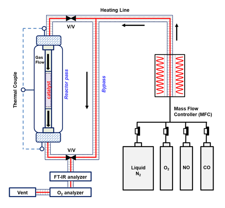 ๊ณต๊ธ ๊ฐ์ค์ ์ ๋์ ์กฐ์ ํ์๋ค. ์ด๋งค ๋ฐ์๊ธฐ ๋ชจ์๋๋ ๊ทธ๋ฆผ 1๊ณผ ๊ฐ๋ค. ์ด ์ ๋์ 190 sccm (standard cubic centimeters per minute)์ผ๋ก ๊ณ ์ ํ์์ผ๋ฉฐ, ๊ฐ์ค ์กฐ๊ฑด์ NOX 500 ppm, CO 5000 ppm, O2 0.4 vol%, Balance gas N2, GHSV 22,800 h-1์ด์๋ค. O2๋ฅผ ์ ์ธํ inlet๊ณผ outlet ๋ฐ์ ๊ฐ์ค ๋๋๋ FT-IR (Gasmet, CX-4000)๋ก ๋ถ์ํ์๊ณ , O2 ๋๋๋ Gas analysis spectrometer (Hausnet, DSM-XT)๋ฅผ ์ด์ฉํ์ฌ ๋ถ์ํ์๋ค. ๋ํ, NOX ์ ํ ํจ์จ๊ณผ CO ์ ํ ํจ์จ์ inlet๊ณผ outlet๊ฐ์ค ๋๋๋ฅผ ํ์ฉํ์ฌ ๋ค์๊ณผ ๊ฐ์ ์์ ๋ฐ๋ผ ๊ณ์ฐ๋์๋ค.