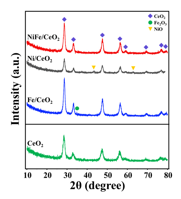 XRD pattern of Fe/CeO2, Ni/CeO2 and NiFe/CeO2 catalysts.