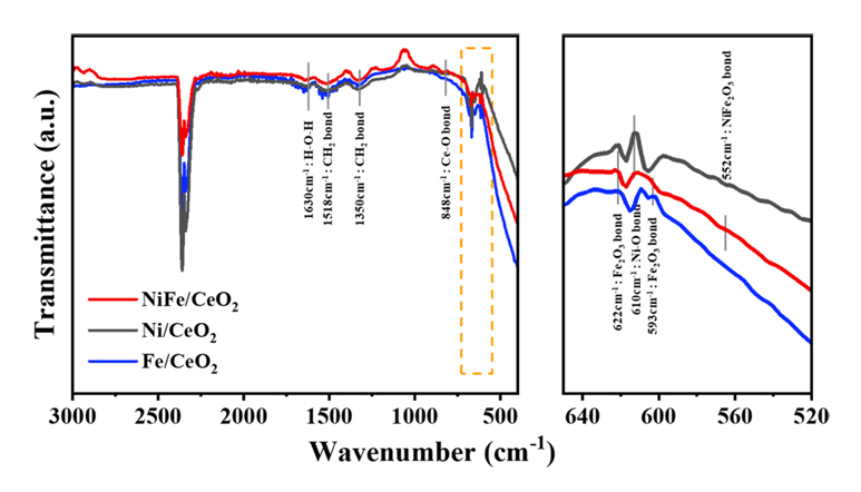 FT-IR ๋ถ์์ ์ํ์ ์์ฉ๊ธฐ ๋ถ์์ ์ํ์ฌ ์งํํ์์ผ๋ฉฐ, ๊ทธ๋ฆผ 3์ ๋ํ๋ด์๋ค. ๋ถ์์ 400-3,000 cm-1 ์์ญ๋์์ ์งํํ์๋ค. ๊ฒฐ๊ณผ๋ก๋ถํฐ ์ด๋งค๋ฌผ์ง์์ Ce-O์ ๊ฒฐํฉ์ด ํ์ฑ๋์์์ ์ ์ ์๋ค. 848 cm-1 peak๋ Ce-O ๊ฒฐํฉ์ ํด๋น๋๋ฉฐ, 1630 cm-1์์ ๋ํ๋ peak๋ ๋ฌผ ๋ถ์์ peak์ ํด๋น๋๋ฉฐ, H-O-H์ bending frequency๋ฅผ ์๋ฏธํ๋ค. 1518 cm-1์ 1350 cm-1์์ ํ์ธ๋ peak์ ๊ฒฝ์ฐ์๋ ์ํ ๋ด์ ์กด์ฌํ๋ ์๋ฅ๋ฌผ์ธ ๊ฒ์ผ๋ก ํ๋จ๋์๋ค[28]. ํ์ฑ ๋ฌผ์ง๋ก Fe๊ฐ ์ฒจ๊ฐ๋ ๋จ์ผ ์ด๋งค์์๋ 593 cm-1๊ณผ 622 cm-1์์ Fe2O3์ ํด๋นํ๋ peak๋ฅผ ํ์ธํ ์ ์์๋ค. ๋ํ Ni ๋จ์ผ ์ด๋งค์์๋ 610 cm-1์ ํด๋น peak๋ฅผ ํ์ธํ ์ ์์์ผ๋ฉฐ, ์ด๋ Ni-O stretching bond๋ฅผ ๋ํ๋ด๋ ๊ฒฐํฉ์ธ ๊ฒ์ผ๋ก ํ์ธ๋์๋ค[29]. ์ด ๋ ๋ฌผ์ง์ด ํจ๊ป ์ฒจ๊ฐ๋ NiFe/CeO2 ์ด๋งค์์๋ NiFe2O3์ ํด๋นํ๋ 522 cm-1์์ peak๊ฐ ์กด์ฌํ์ฌ ์๋ก์ด ์์ฉ๊ธฐ๊ฐ ์์ฑ์ด ๋์์์ ์ ์ ์์๋ค[30]. ์ด๋ฌํ ๊ฒฐ๊ณผ๋ฅผ ํตํ์ฌ ํฉ์ฑ๋ ์ด๋งค์ ์กด์ฌํ๋ Ni-O์ Fe2O3๊ฐ ํ๋ฉด์์ ์ด๋งค๋ฐ์์ ํ์ฑํ์์ผฐ์ผ๋ฉฐ, bimetallic ์ด๋งค์์์ NiFe2O3๊ฐ ์ด๋งค ํ์ฑ์ ์ํฅ์ ์ค ์ ์๋ ์๋ก์ด ์์์์ ํ์ธํ ์ ์์๋ค.