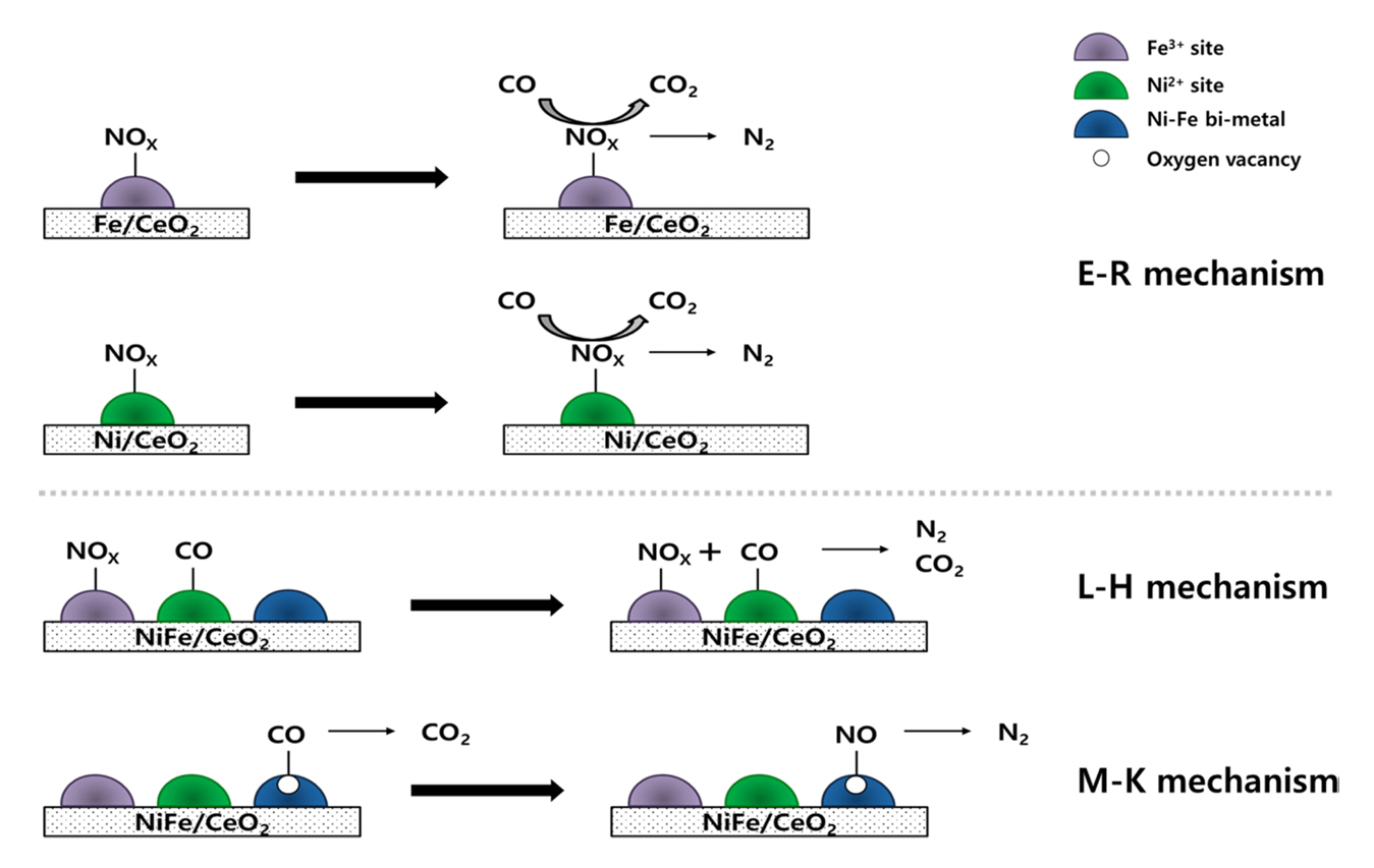 Reaction scheme of NO reduction by CO over Fe/CeO2, Ni/CeO2, NiFe/CeO2 catalysts.