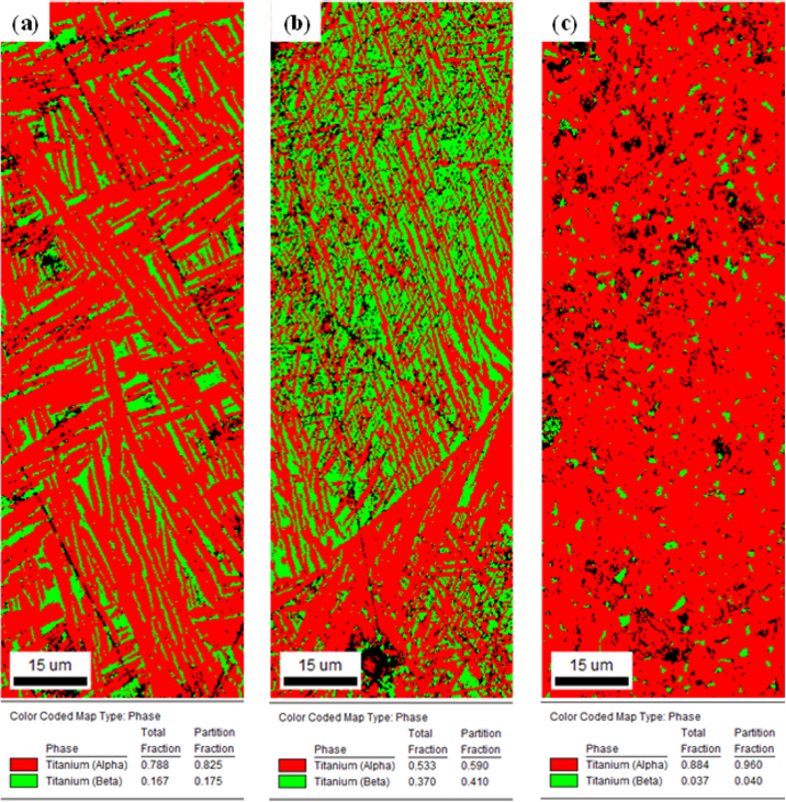 Phase maps of (a) Ti-5Mo-2Fe, (b) Ti-9.2Mo-2Fe and (c) Ti-6Al-4V ELI alloys