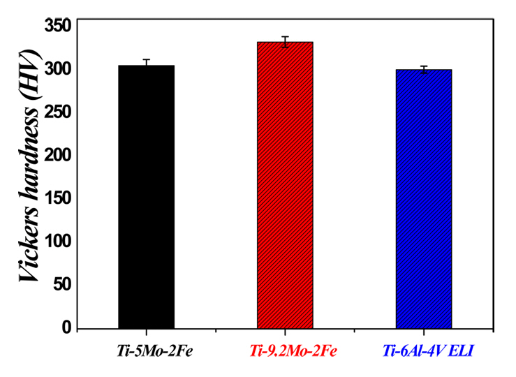 Hv가 측정되었으며, Ti-6Al-4V ELI 합금의 경우에는 평균 경도 300.7±4.1 Hv가 측정되었다. Ti-xMo-2Fe (x = 5, 9.2