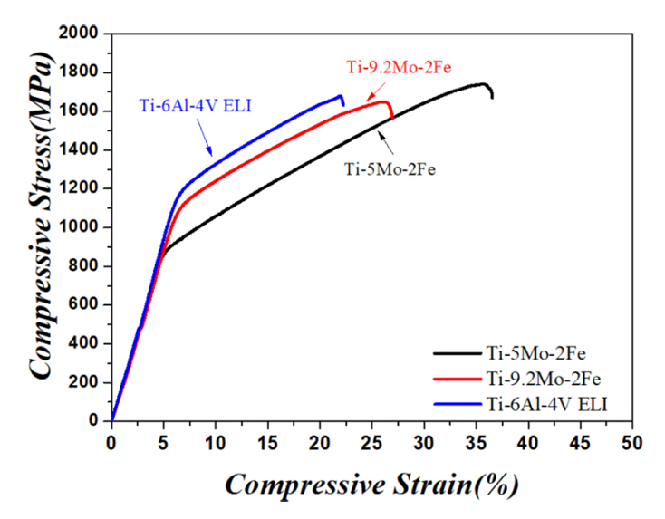 압축 변형률 21.9%으로, Ti-xMo-2Fe (x = 5, 9.2 wt%)합금이 Ti-6Al-4V ELI 합금보다 높은 최대 압축강도 및 압축