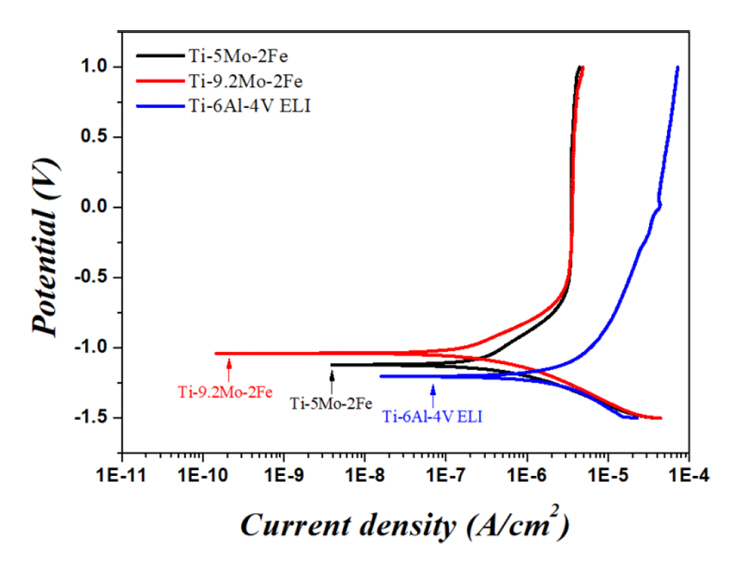 Potentiodynamic polarization curves of Ti-5Mo-2Fe, Ti-9.2Mo-2Fe and Ti-6Al-4V ELI