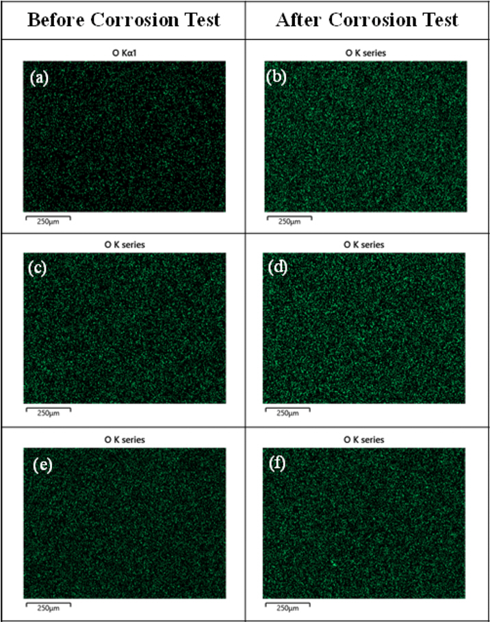 SEM-EDS analysis O maps of (a) Ti-5Mo-2Fe, (b) Corroded Ti-5Mo-2Fe, (c) Ti-9.2Mo-2Fe,