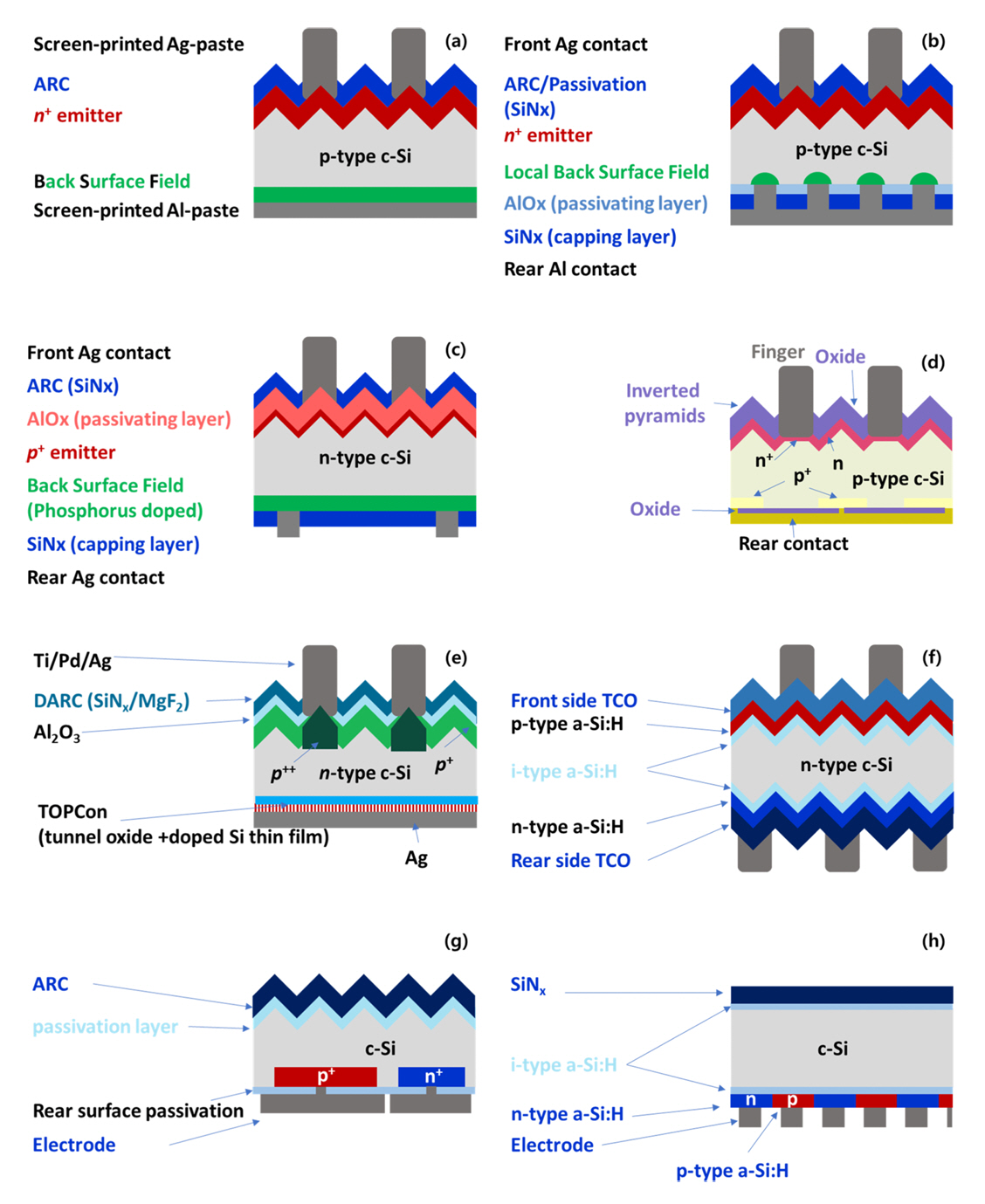 T, (d) PERL; Passivated emitter rear L, (e) TOPCon; Tunnel oxide passivation contact,