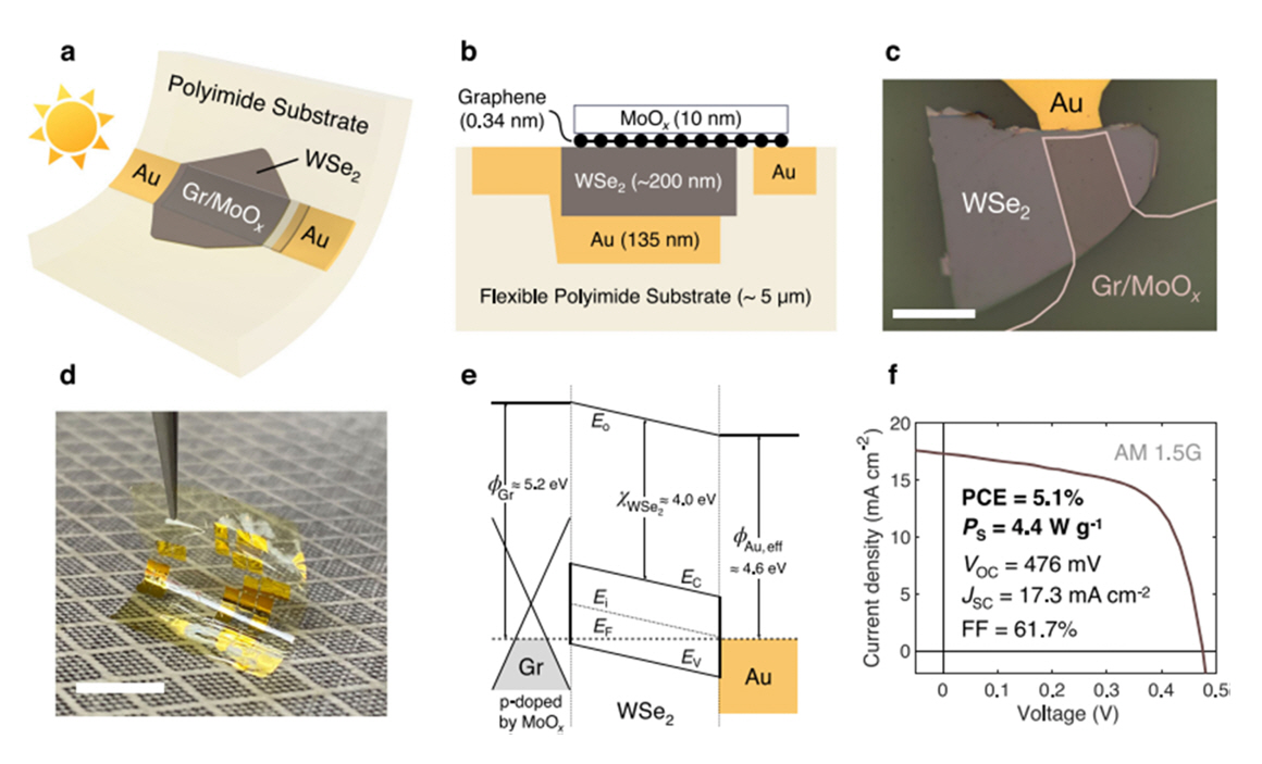 태양전지에 대해 그림 3과 같이 나타내었는데 투명한 그래핀을 사용하였으며 몰리브데늄 산화물 (Molybdenum, MoOX) capping을 통해 도핑, 패시베이션 및 반사 방지막으로 활용하였다[30]. 이를 통해 유연한 WSe2 태양전지의 효율을 5.1%로 높였으며 특정 전력은 4.4 W/g로 기존 박막 태양전지 기술과 비슷한 수준까지 도달했으며 이는 Fermi-level