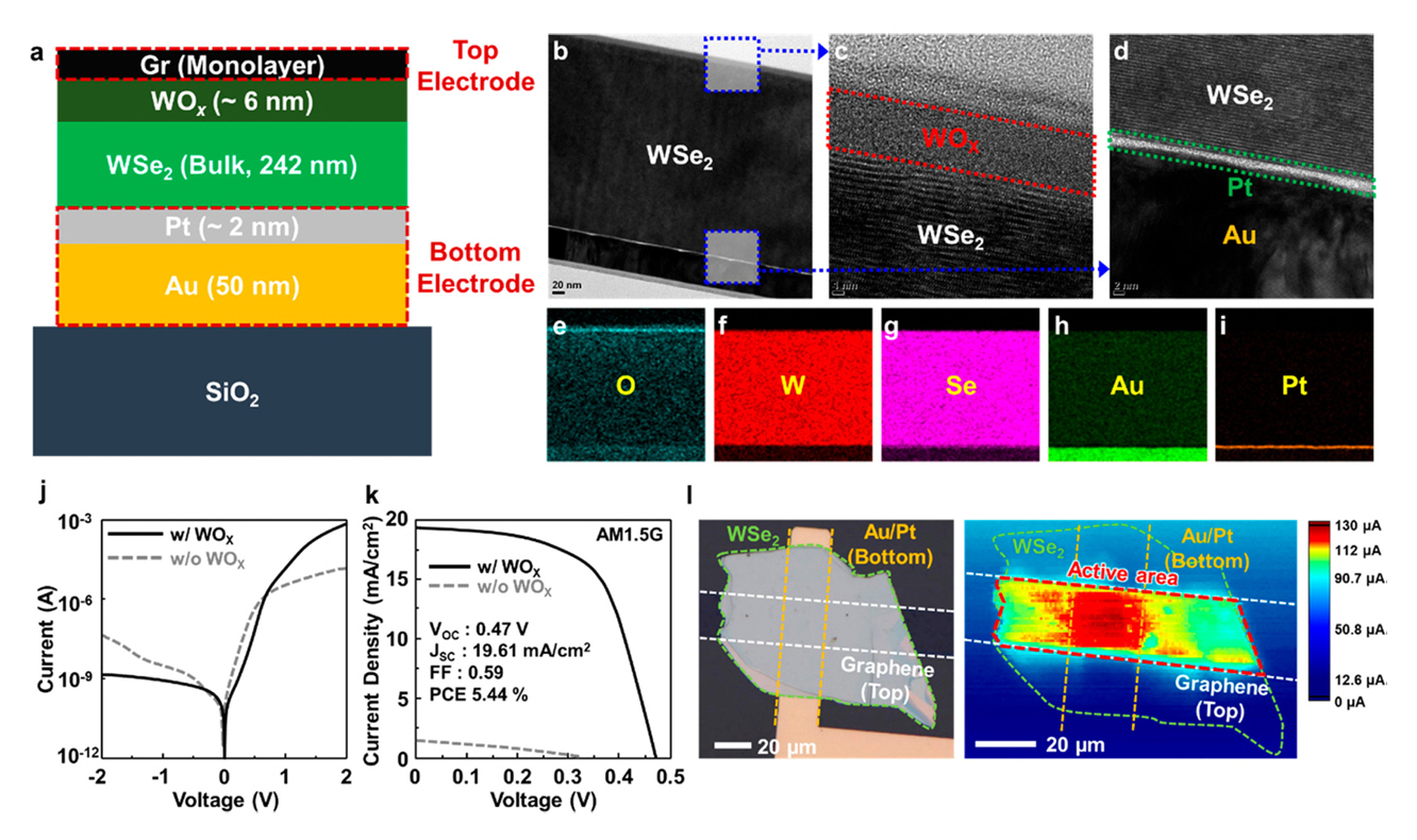 전압 특성 개선이 될 것으로 내다봤다 [30]. K. -H. Kim 그룹은 WSe2 기반의 태양전지를 통해 5.44%의 높은 변환효율을 달성하였는데 242 nm 두께의 WSe2, WOX 6 nm 두께 및 단일층의 그래핀을 활용하여 제작한 것이다. 이들 또한 WOX가 WSe2 계면에서 Fermi-level pinning에 의한 한계를 극복하는 기술로 강한 내부 전계를 촉진하여 전자를 선택적으로 접촉하는 것으로 보고하였다[31].