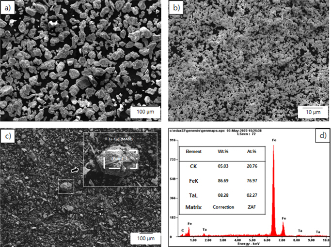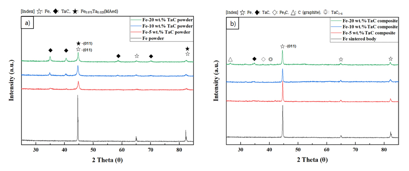 ์ด๊ธฐ ์๋ฃ ๋ถ๋ง๋ก๋ Fe ๋ถ๋ง(Yuelong metal powder Co. Ltd, ์๋ 99.95%, 5~10 ฮผm)๊ณผ TaC ๋ถ๋ง(Alfa, LTD,