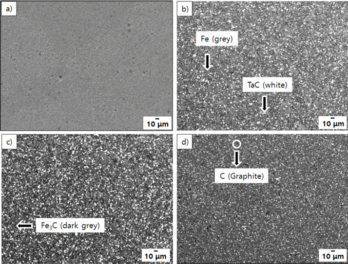 ๊ฒ์ผ๋ก ํ๋จํ์๋ค. ๊ทธ๋ฆผ 4์ ์๊ฒฐ์ฒด์ ๋ฏธ์ธ์กฐ์ง ๋ถ์ ๊ฒฐ๊ณผ๋ฅผ ๋ํ๋ด์๋ค. TaC๊ฐ Fe ๋งคํธ๋ฆญ์ค์ ๋ถํฌ๋์ด์๋ ํํ๋ก ๋์ด์๋ค.