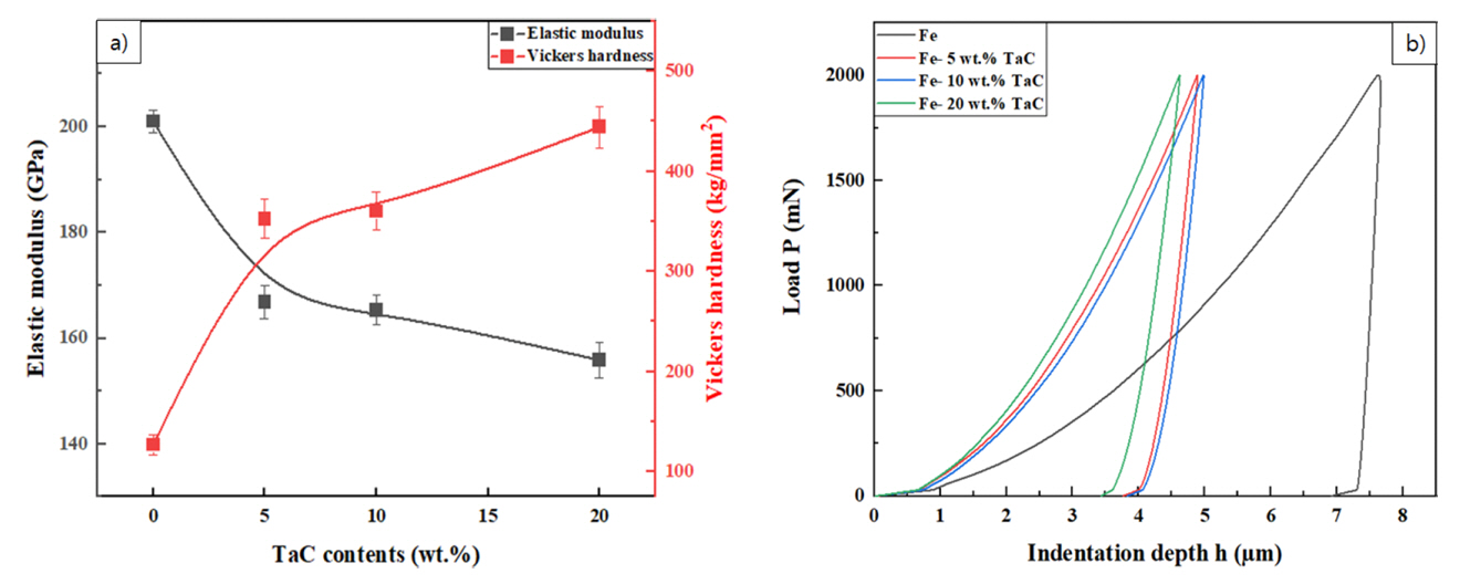 (2) ๊ธฐ๊ณ์ ํน์ฑ์ ํํ๋ฌผ์ ๊ฒฐ์ ๋ฆฝ ์ฌ์ด์ฆ ๋ฐ ๋ด๋ถ ๊ฒฉ์ ๋ณํ ๋ฐ ๋ถ์ฐ ๊ฐํ์ ๋ฐ๋ผ ๊ฐํ ๊ฑฐ๋์ด ๊ฒฐ์ ๋์์ผ๋ฉฐ, 20 wt.% TaC์์ ๊ฐ์ฅ ๋์