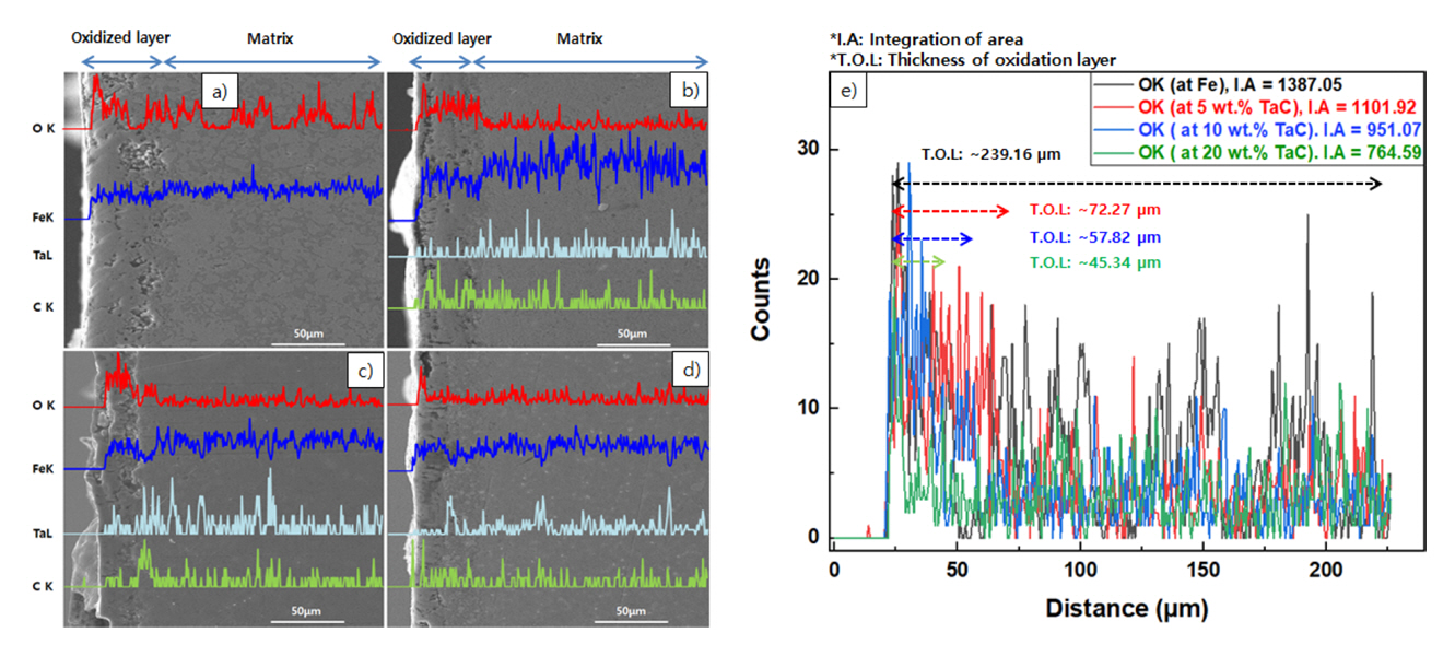 (3) ๋ด์ฐํ์ฑ ํน์ฑ์ XRD, SEM-EDS์ ์ ๋์ ์ธ ๋ฐ์ดํฐ๋ฅผ ํตํด ๋ถ์๋์๋ค. TaCํจ๋์ด ์ฆ๊ฐํจ์ ๋ฐ๋ผ I.A, TOL๊ฐ์ด ์์์ง๋ฉฐ, Fe-20