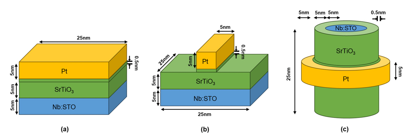 시뮬레이션을 위한 소자 구조 모델은 그림 1과 같다. 가장 기본 구조는 그림 1a와 같은 평면형(planar) 구조이다. 실험적으로는 하부 전극 물질인 Nb-STO와 활물질인 STO를 대면적 평면 구조로 증착하고, 수십~수백 마이크론(m)